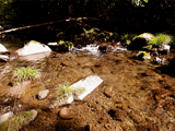 あまごくんは手前の大きな岩と向こう側に並んだ岩の間の流れから